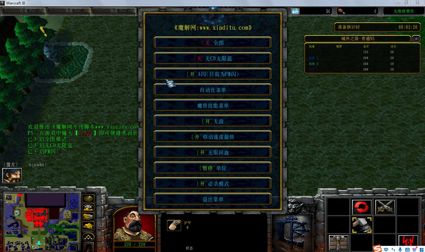 | 技能菜单【光环类技能】 | 自动化菜单【自动加钱木,提升英雄三围】 |