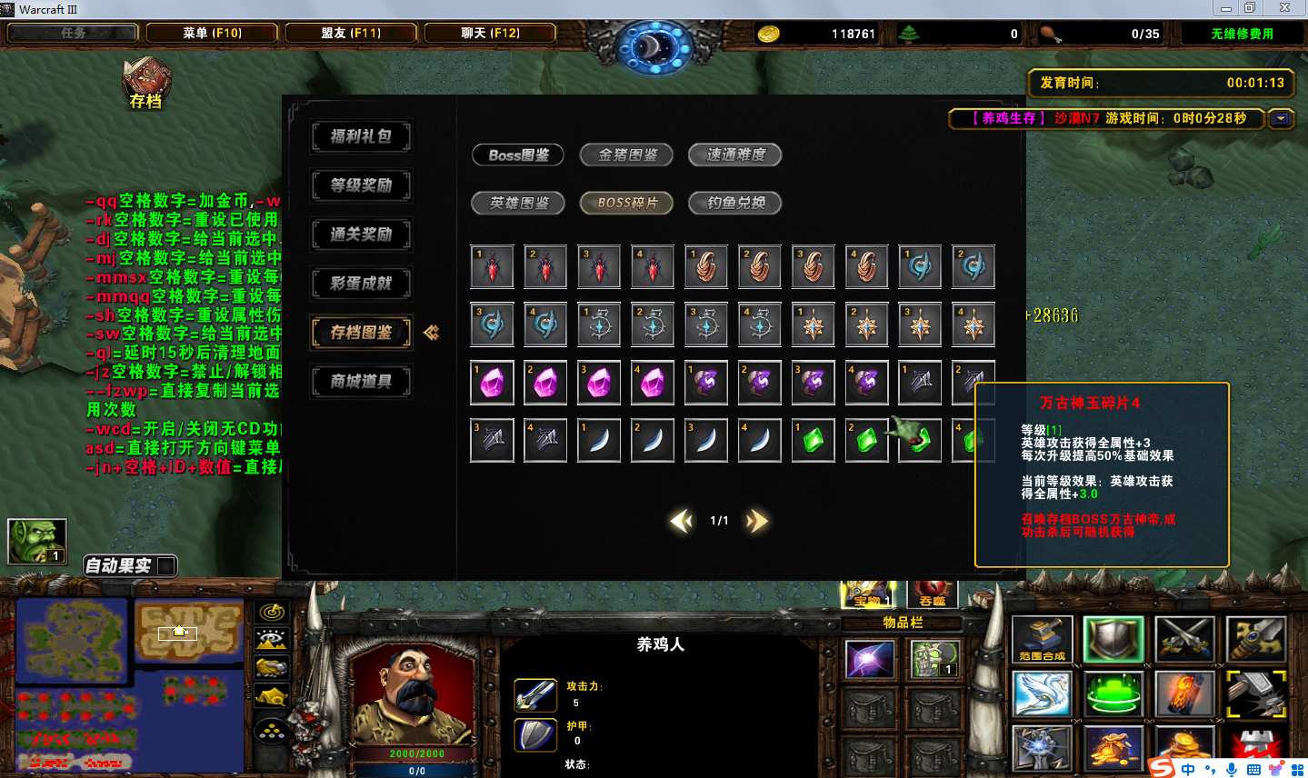 地图名字:养鸡生存1.0.45地图下载+全商城特权+全存档+无CD+指令功能