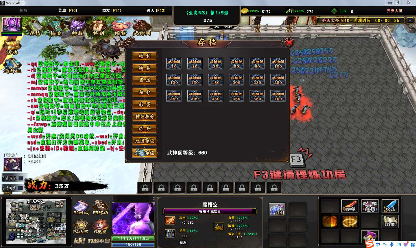 地图名字:齐天大圣1.0.43地图下载+全商城特权+全存档+隐藏英雄+无CD+指令功能