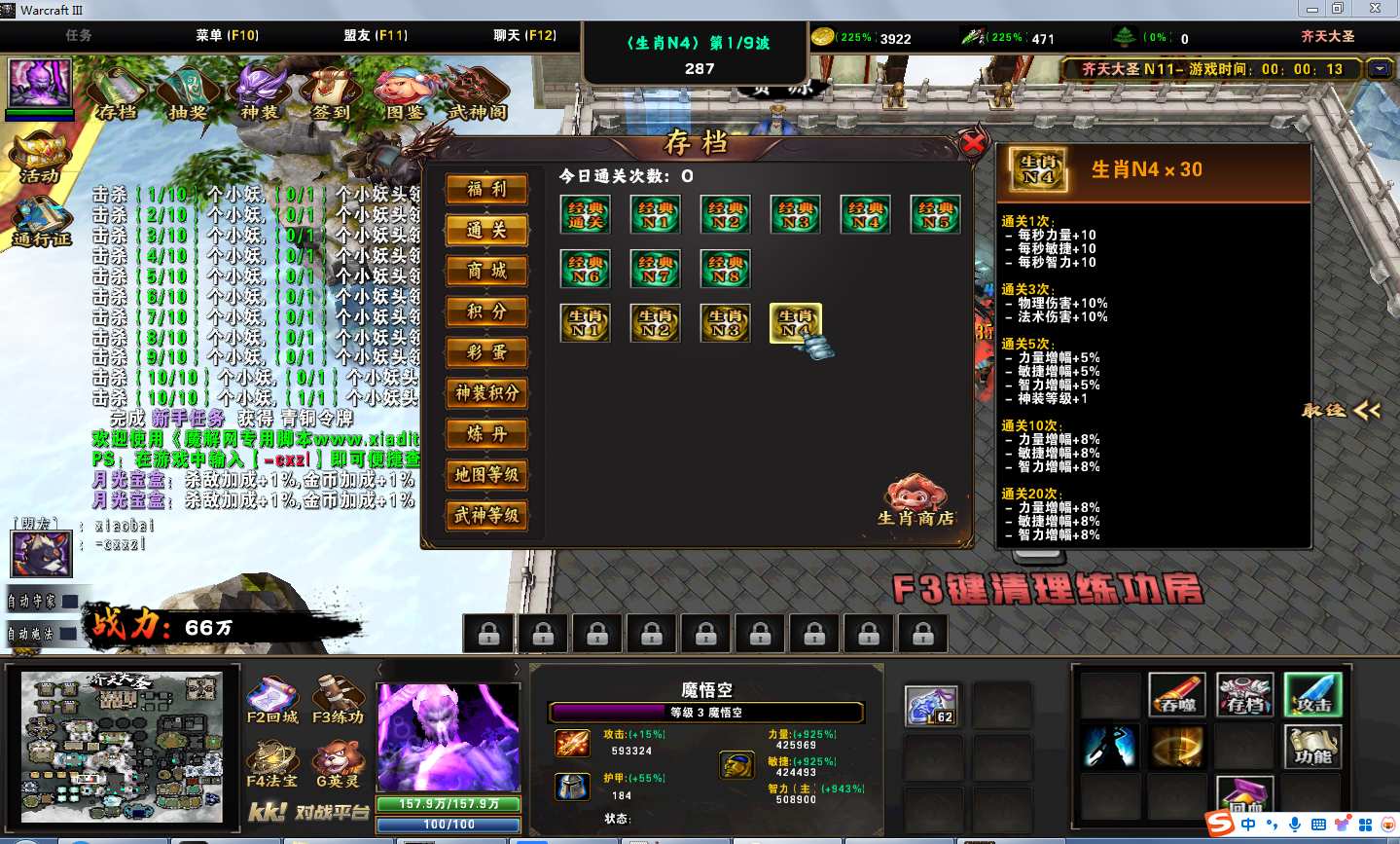 地图名字:齐天大圣1.0.50地图下载+全商城特权+全存档+隐藏英雄+无CD+指令功能