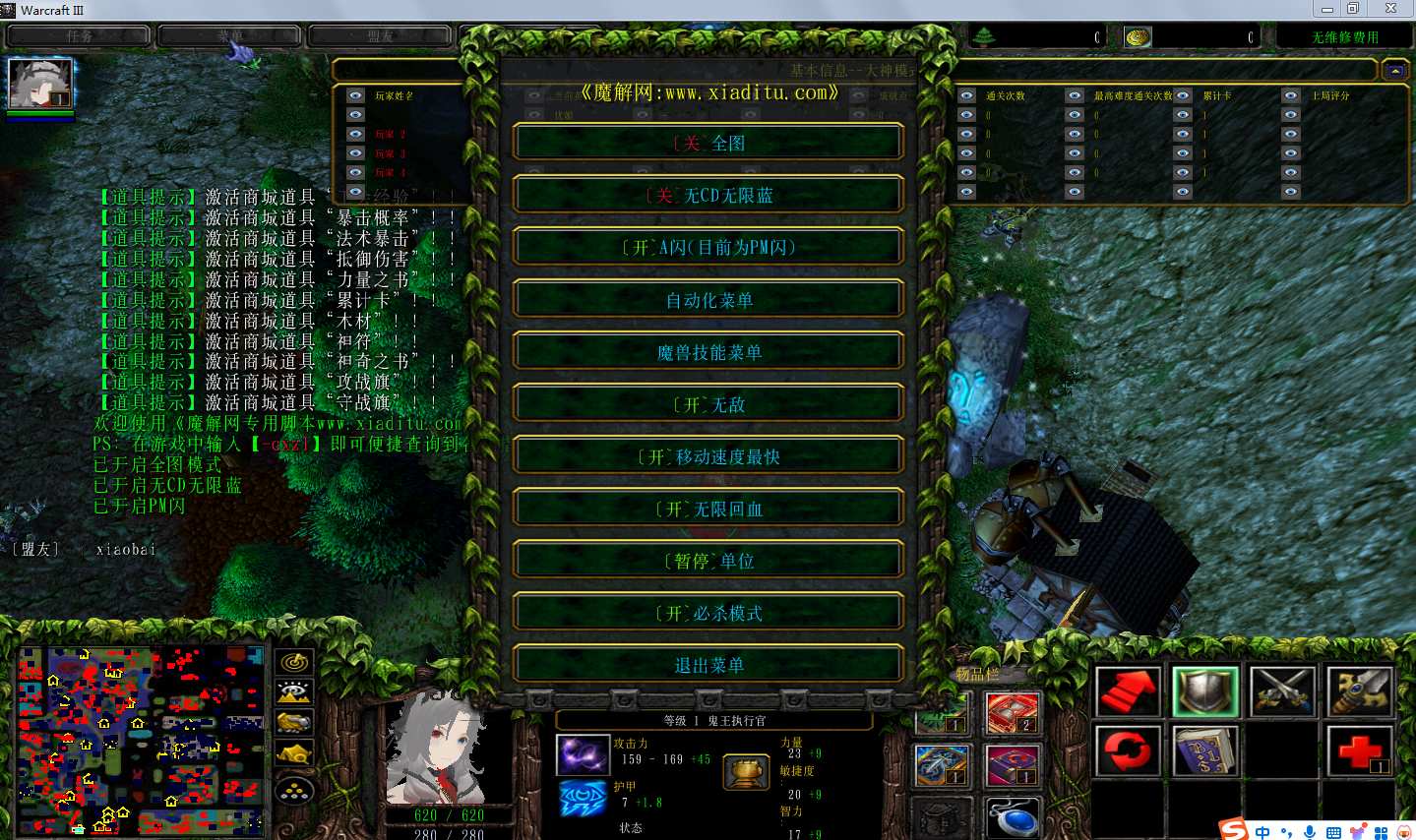 | 技能菜单【光环类技能】 | 自动化菜单【自动加钱木,提升英雄三围】 |
