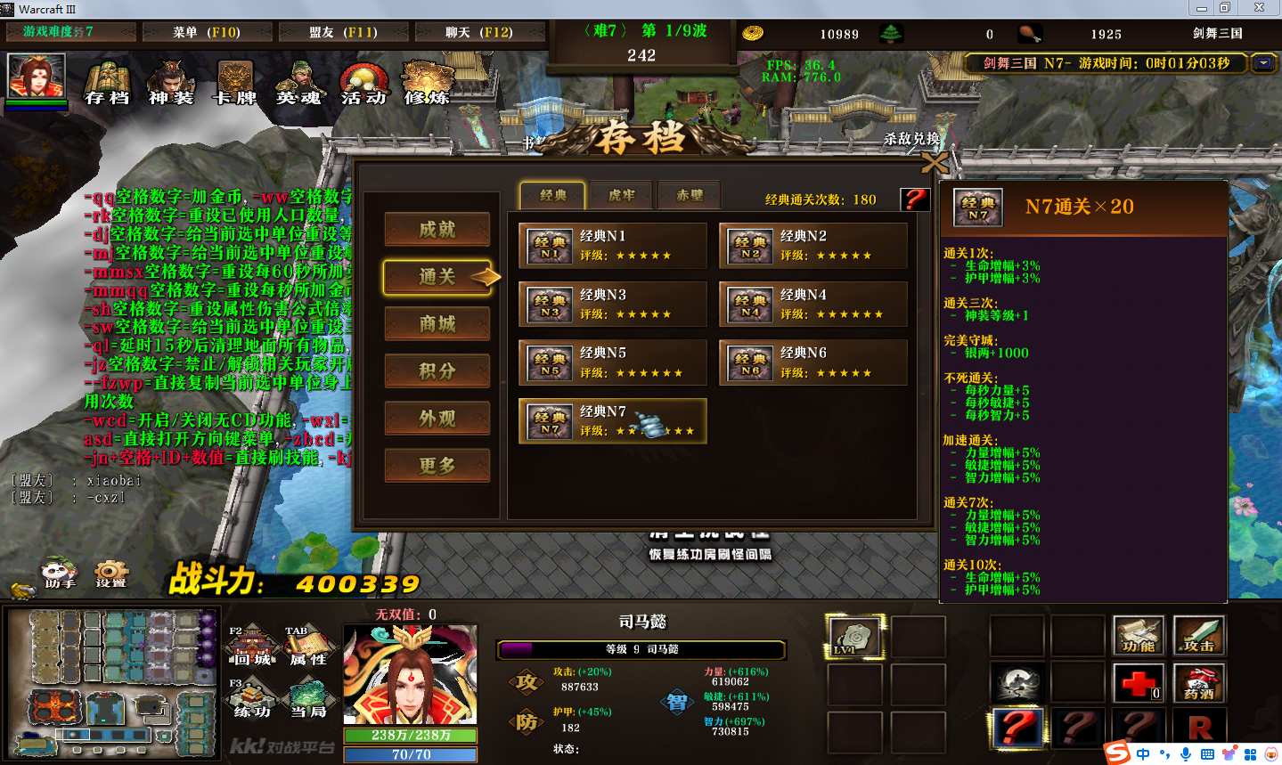 地图名字:剑舞三国1.0.48地图下载+全商城特权+全存档+隐藏英雄+无CD+指令功能