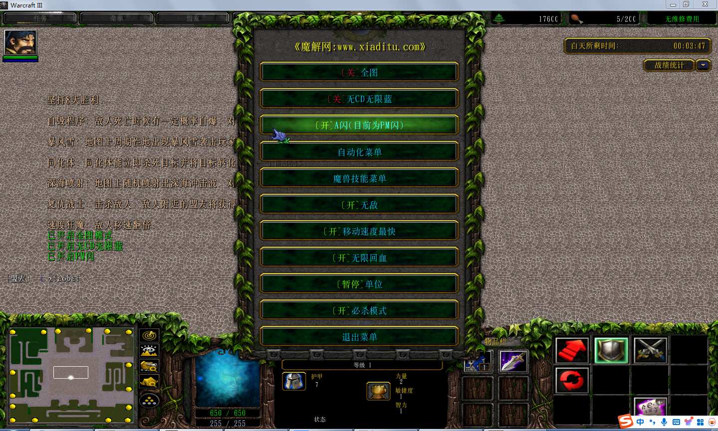 | 技能菜单【光环类技能】 | 自动化菜单【自动加钱木,提升英雄三围】 |