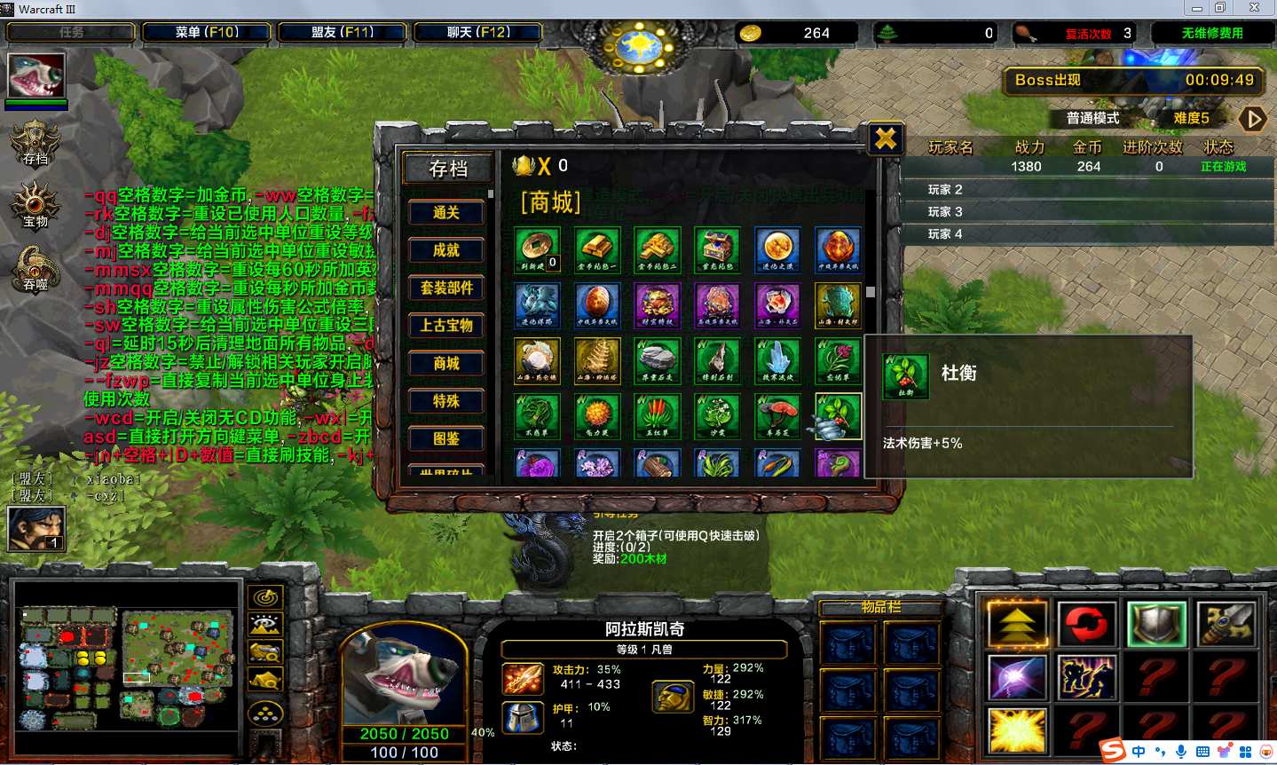 | 技能菜单【光环类技能】 | 自动化菜单【自动加钱木,提升英雄三围】 |