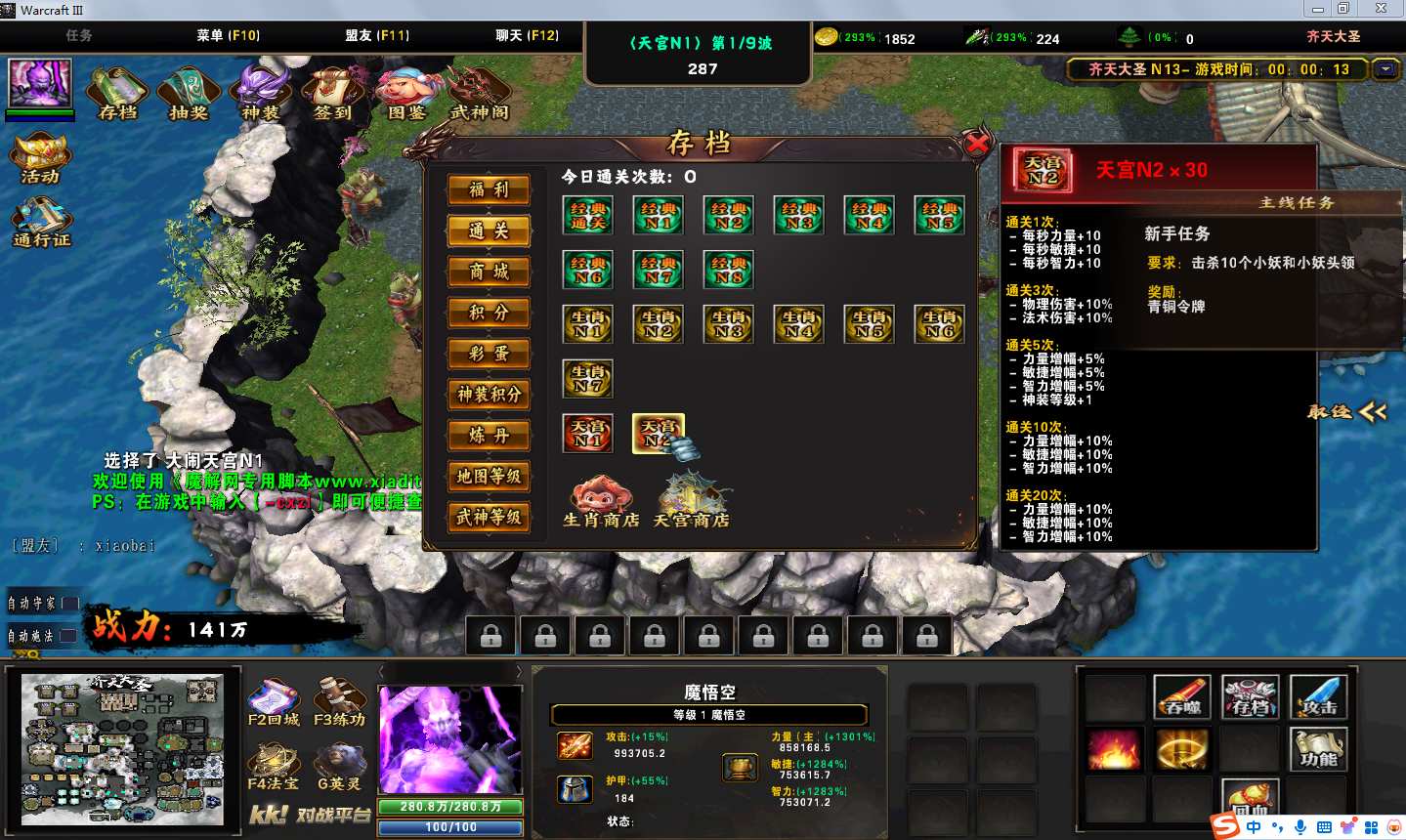齐天大圣1.0.67地图下载+全商城特权+全存档+隐藏英雄+无CD+指令功能: