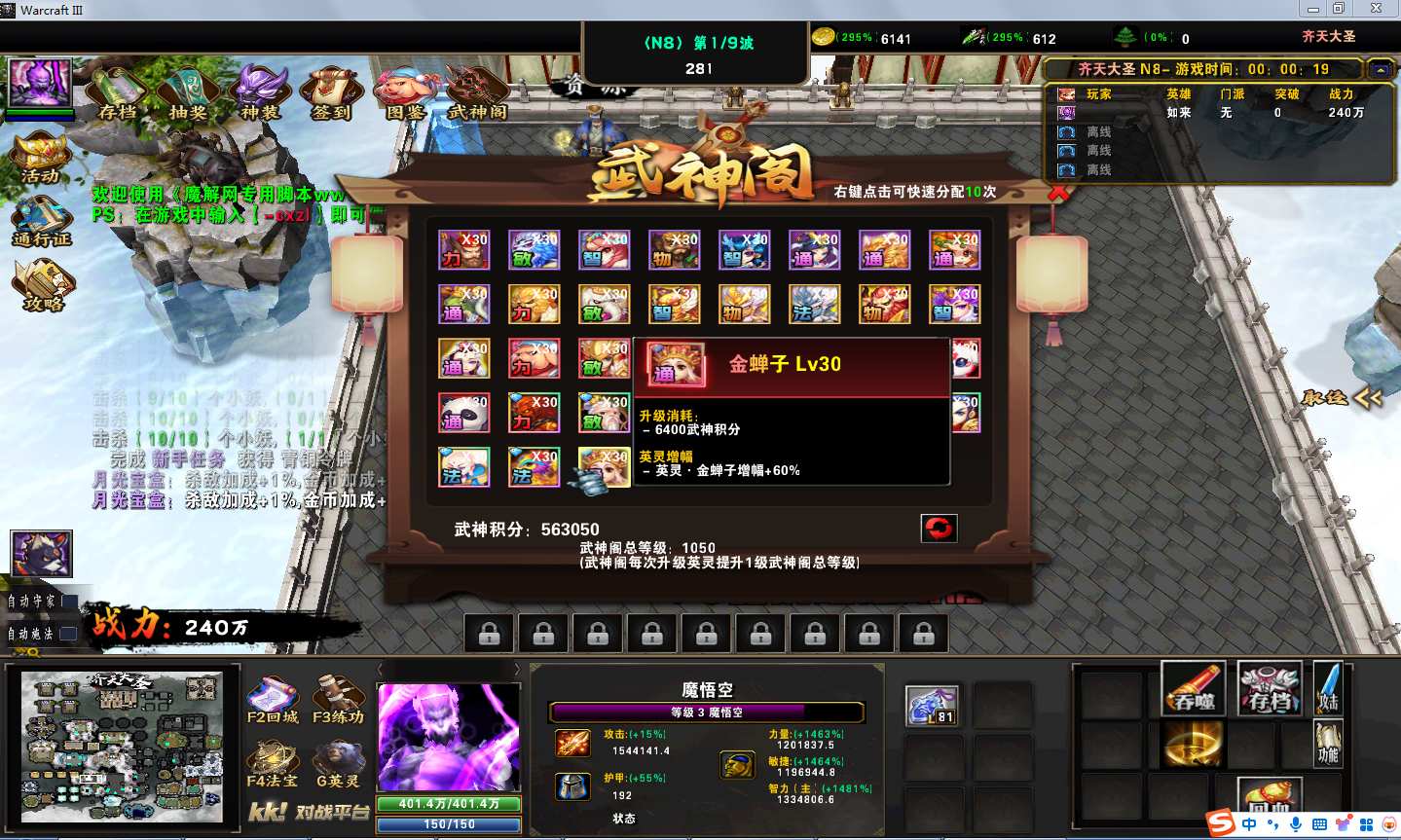 地图名字:齐天大圣1.0.70地图下载+全商城特权+全存档+隐藏英雄+无CD+指令功能