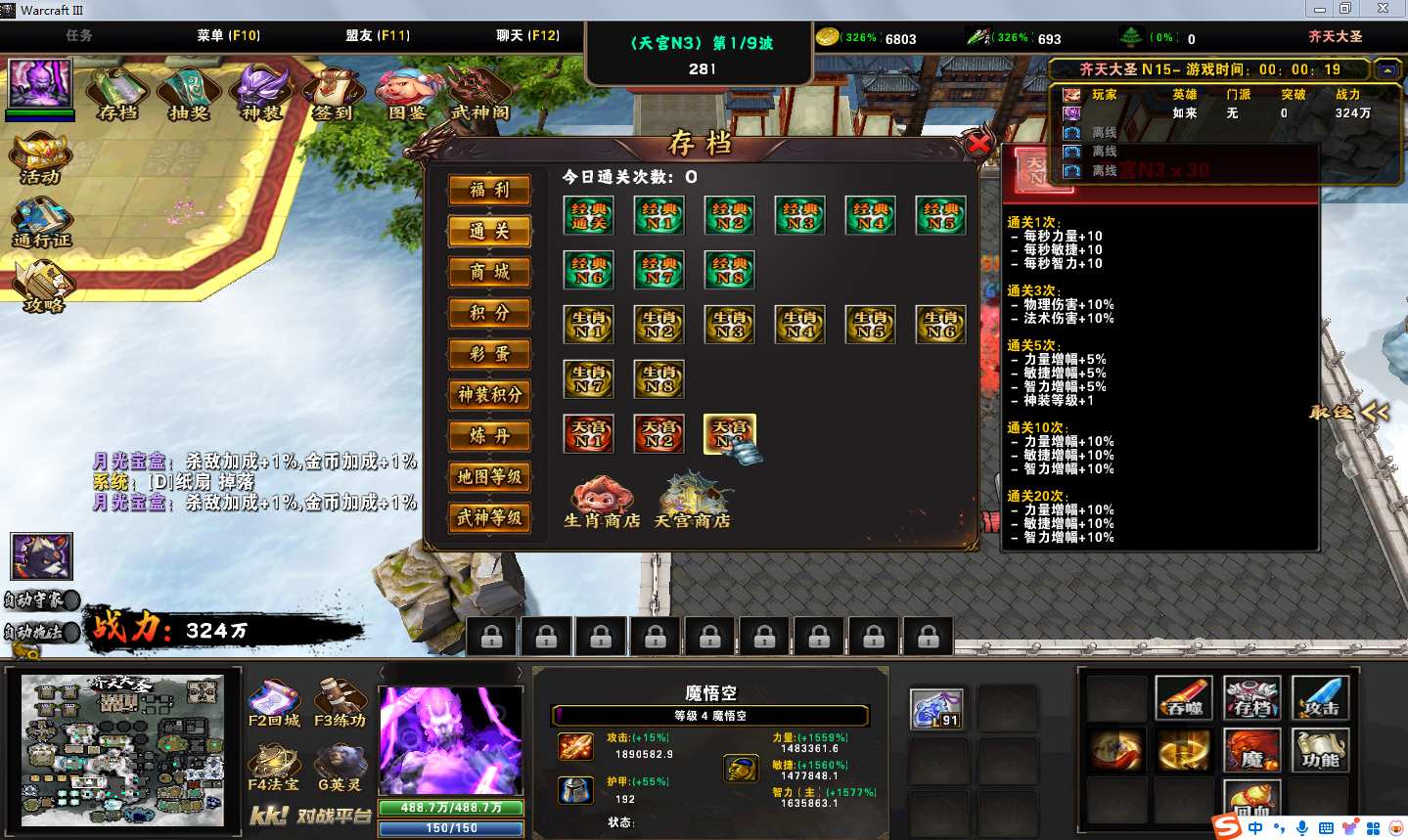 地图名字:齐天大圣1.0.76地图下载+全商城特权+全存档+隐藏英雄+无CD+指令功能