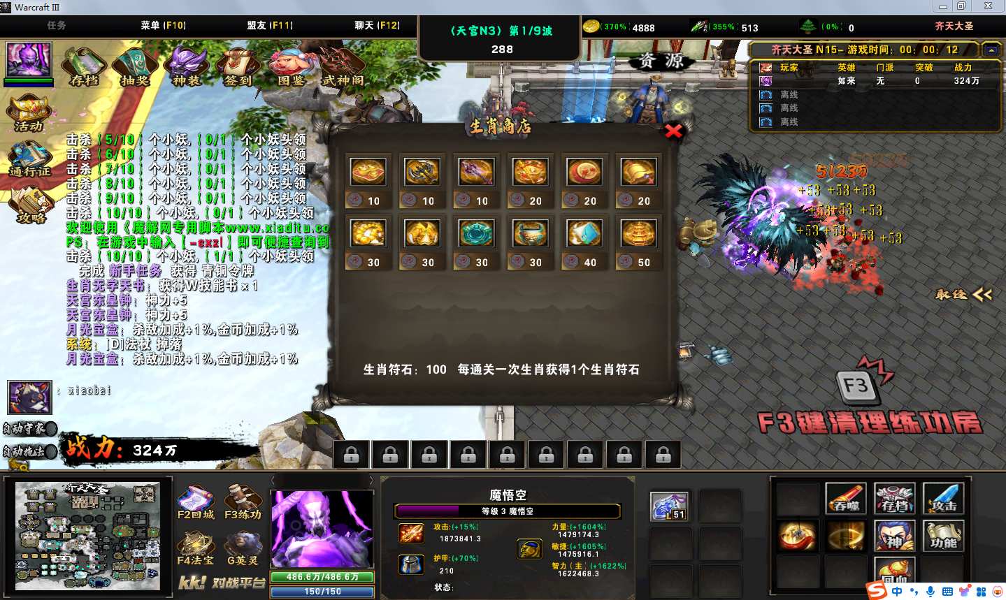 地图名字:齐天大圣1.0.79地图下载+全商城特权+全存档+隐藏英雄+无CD+指令功能
