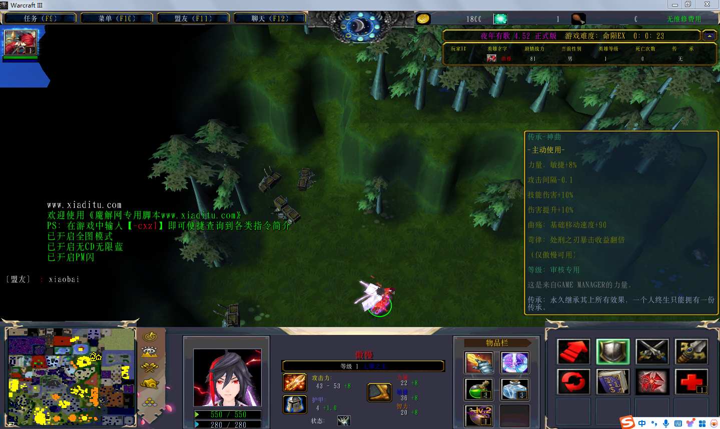 地图名字:夜年有歌4.5.2地图下载+全商城特权+全存档+隐藏英雄+无CD+指令功能