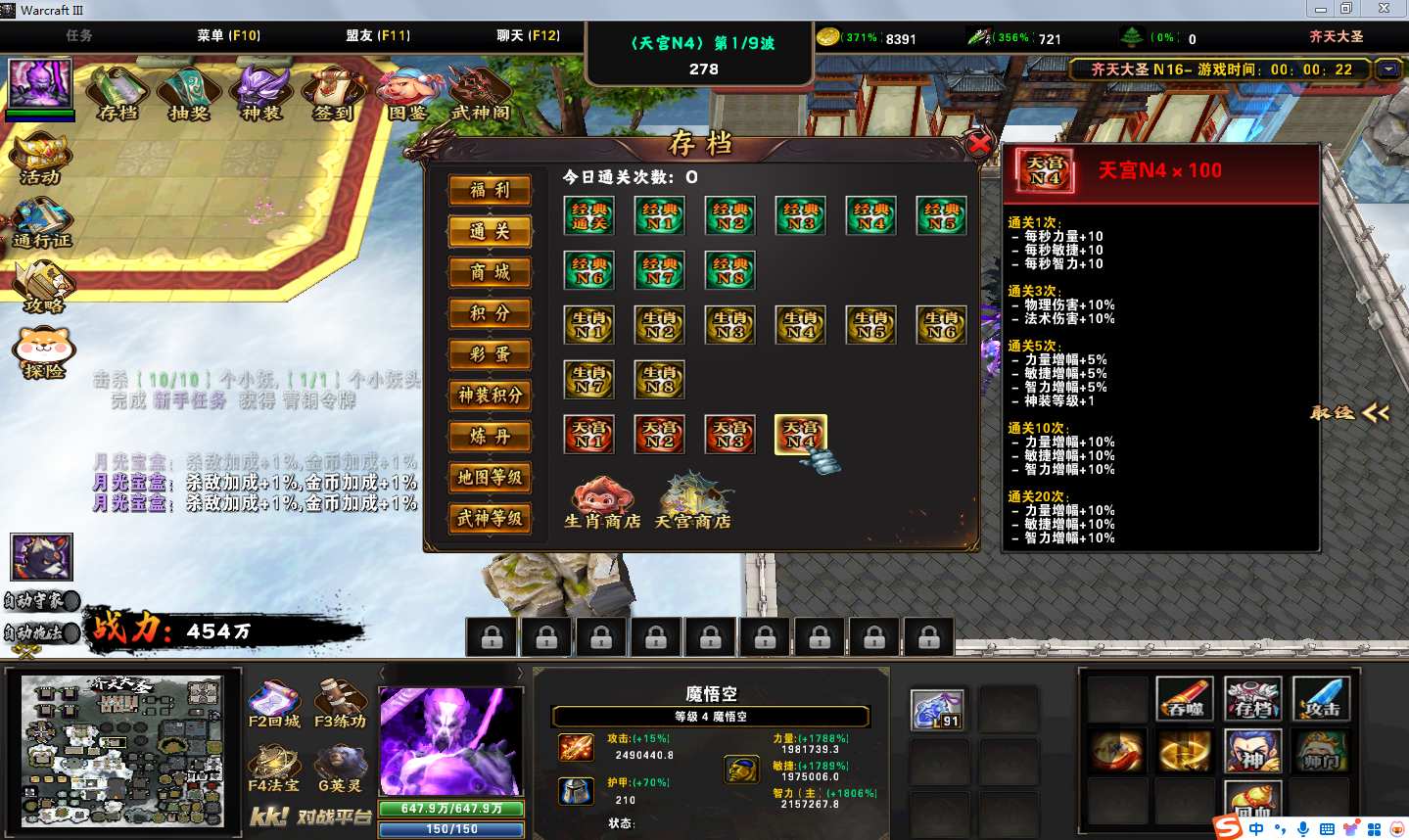 地图名字:齐天大圣1.0.84地图下载+全商城特权+全存档+隐藏英雄+无CD+指令功能