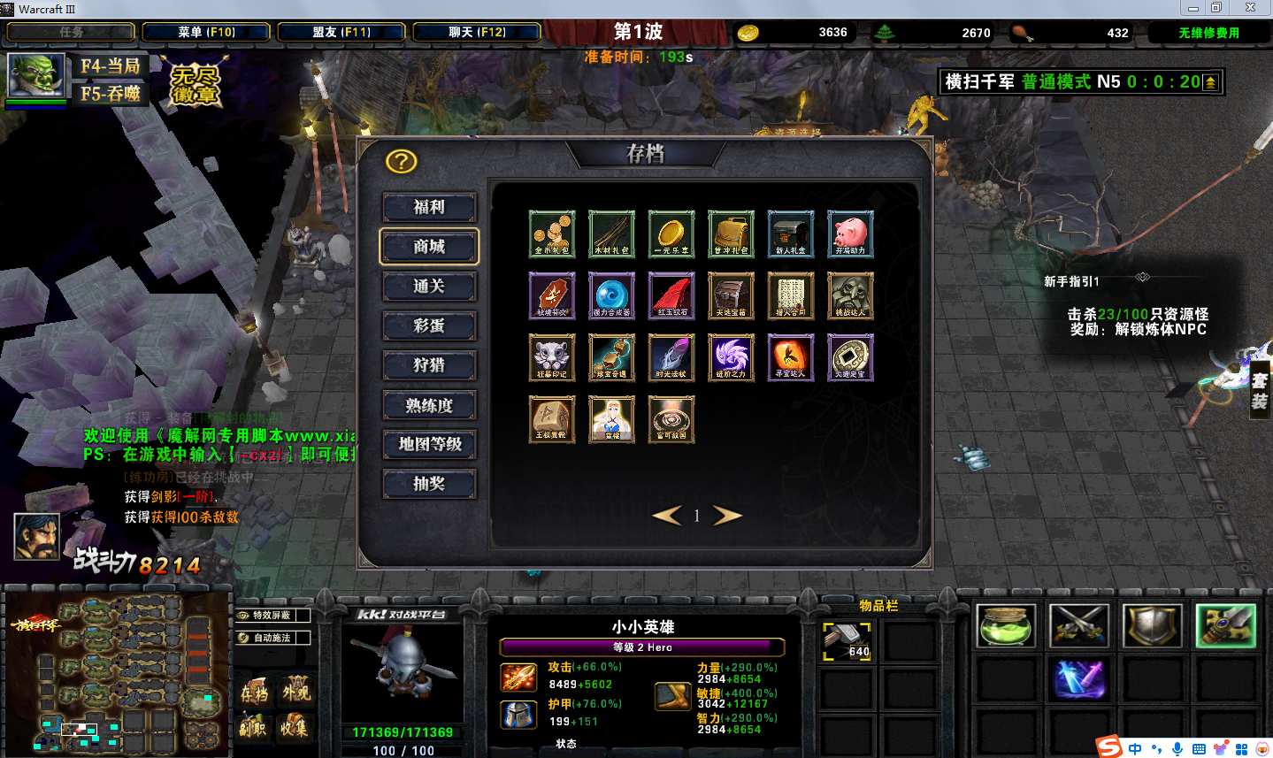 | 技能菜单【光环类技能】 | 自动化菜单【自动加钱木,提升英雄三围】 |