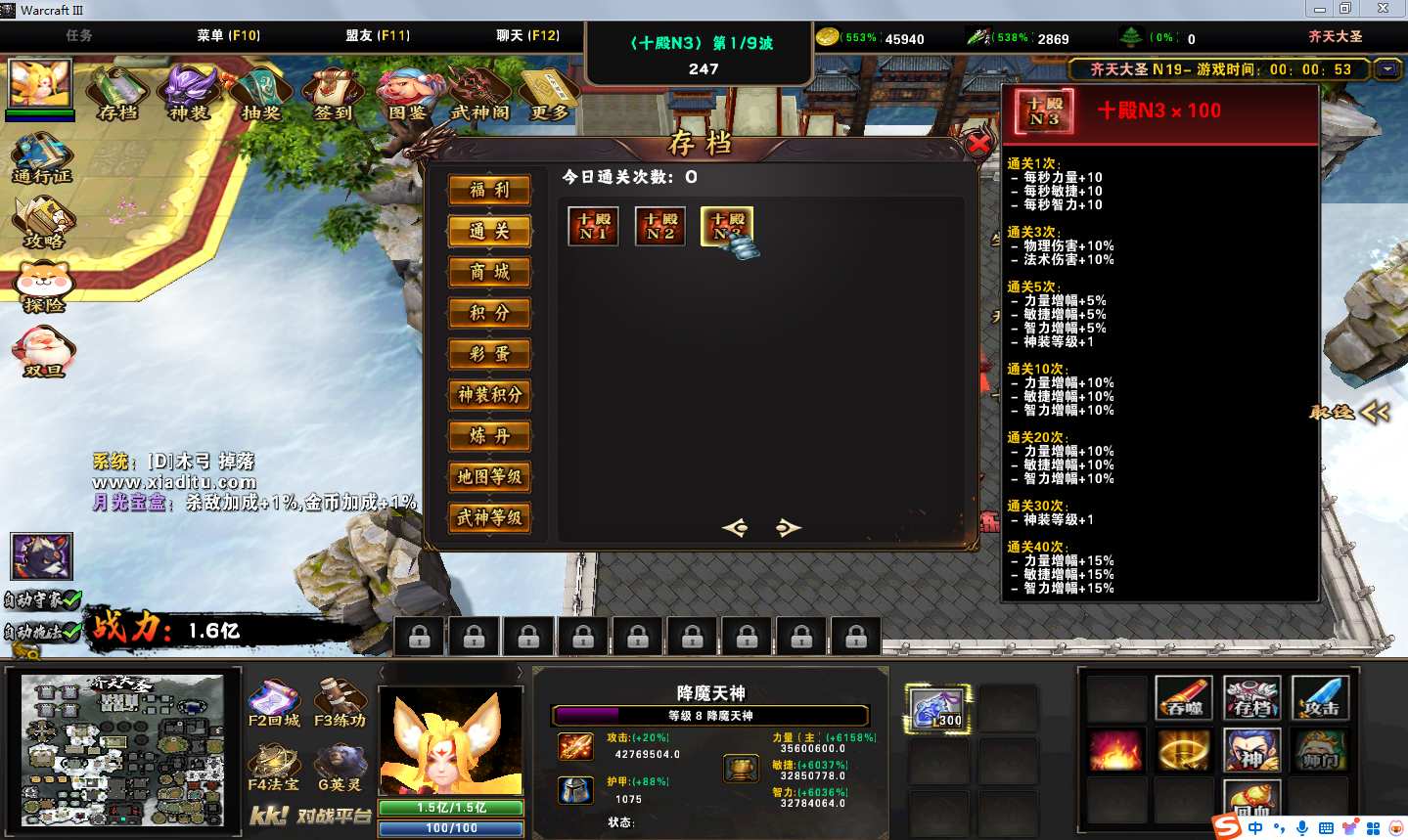 地图名字:齐天大圣1.0.114地图下载+全商城特权+全存档+隐藏英雄+无CD+指令功能