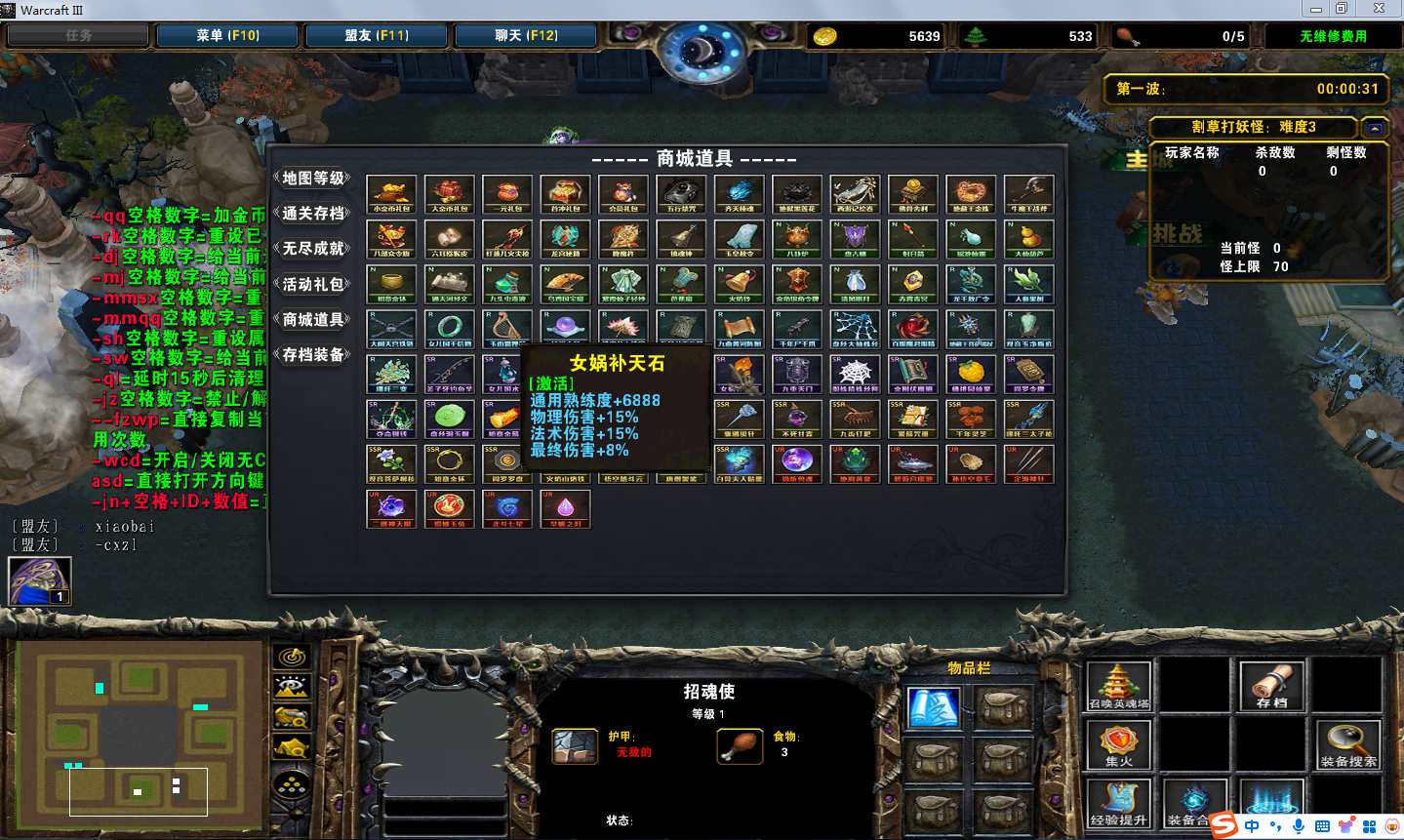| 技能菜单【光环类技能】 | 自动化菜单【自动加钱木,提升英雄三围】 |