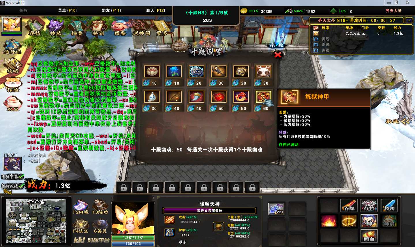地图名字:齐天大圣1.0.118地图下载+全商城特权+全存档+隐藏英雄+无CD+指令功能
