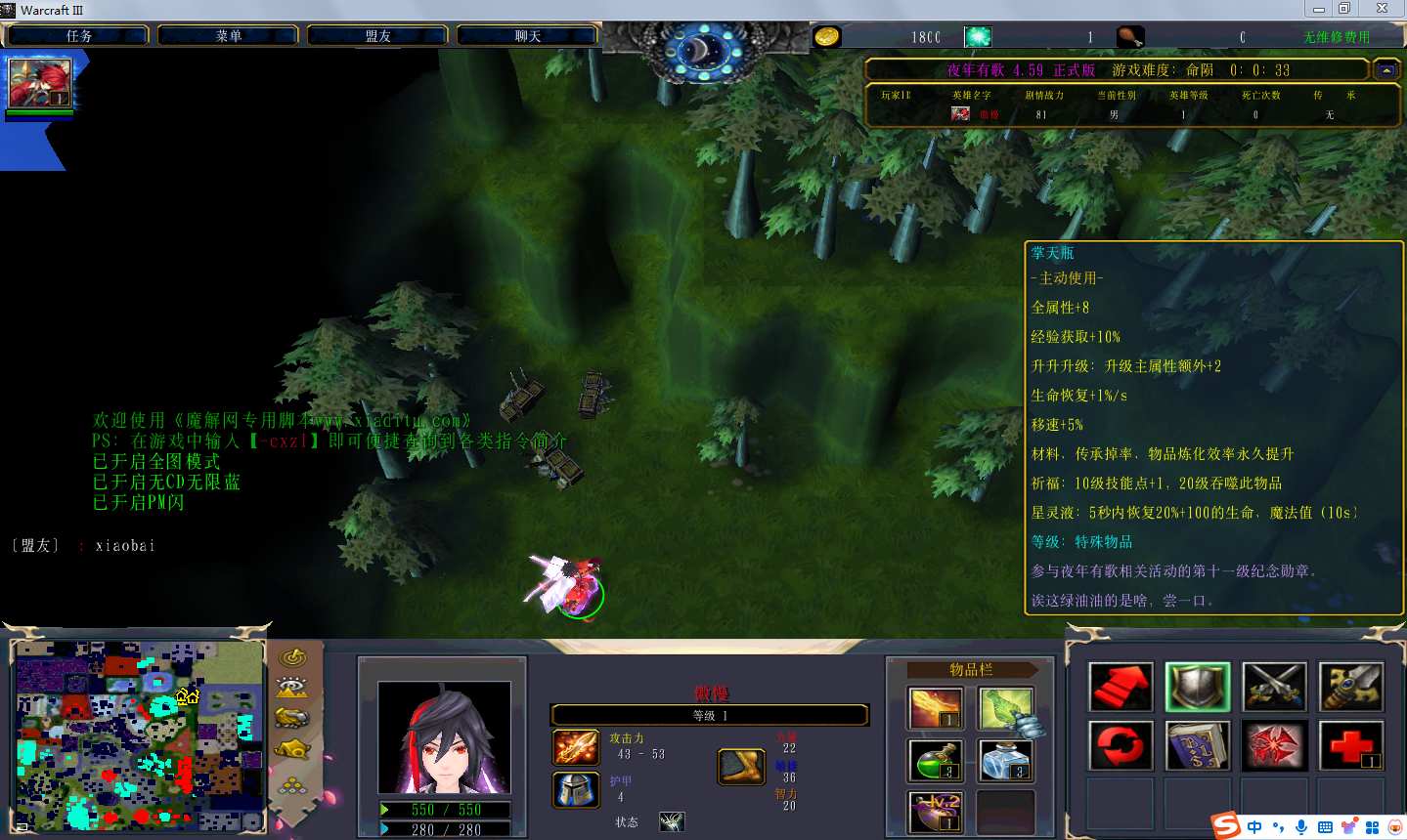 地图名字:夜年有歌4.5.9地图下载+全商城特权+全存档+隐藏英雄+无CD+指令功能