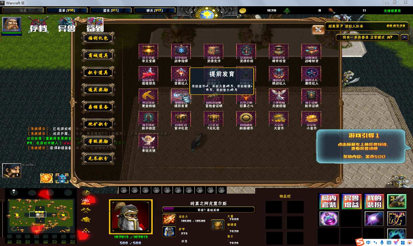 | 技能菜单【光环类技能】 | 自动化菜单【自动加钱木,提升英雄三围】 |