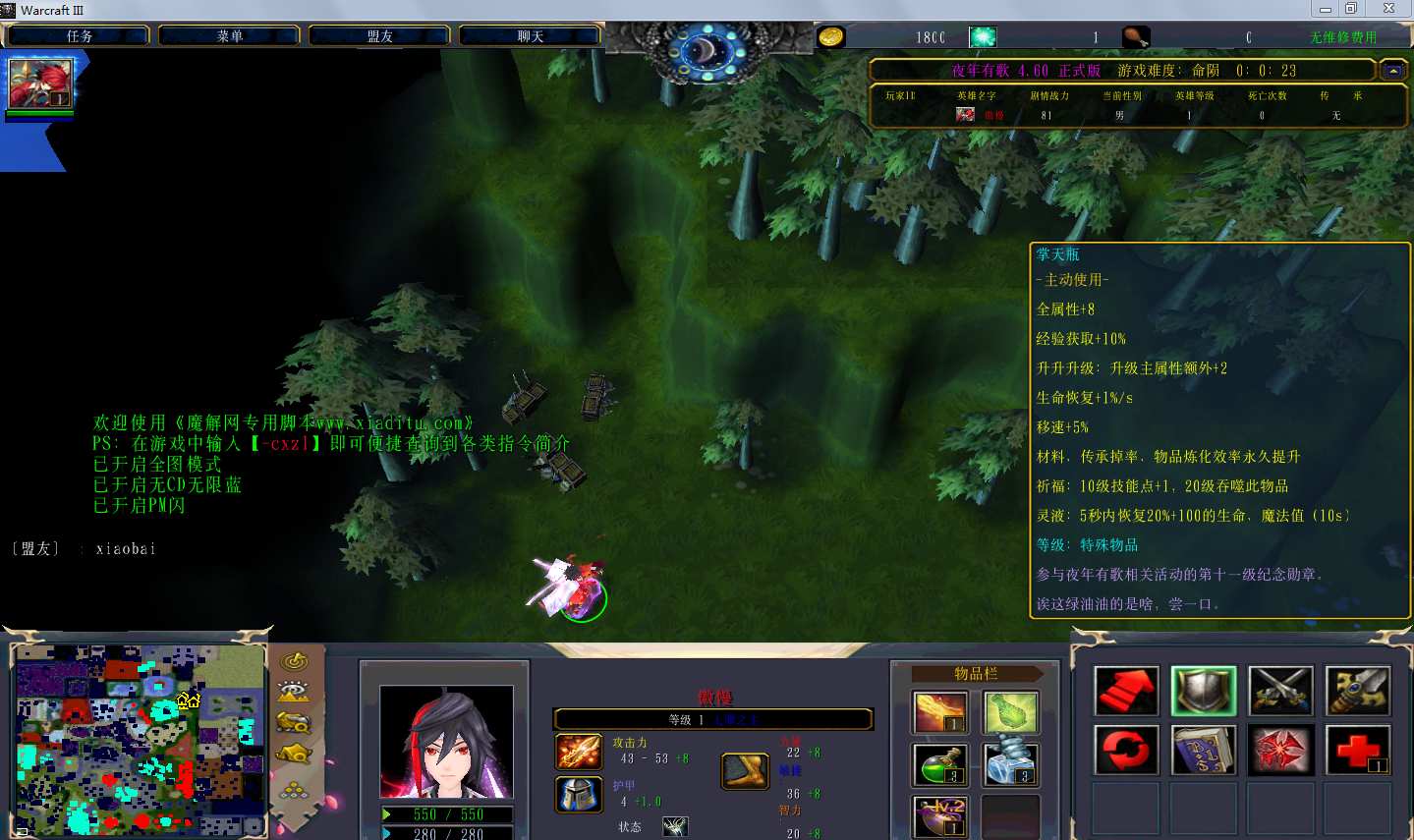 地图名字:夜年有歌4.6.0地图下载+全商城特权+全存档+隐藏英雄+无CD+指令功能