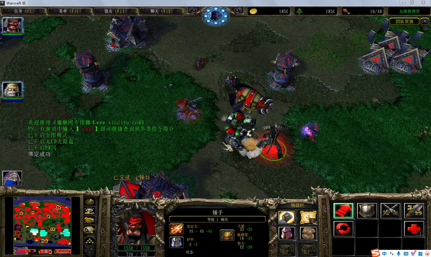 | 技能菜单【光环类技能】 | 自动化菜单【自动加钱木,提升英雄三围】 |