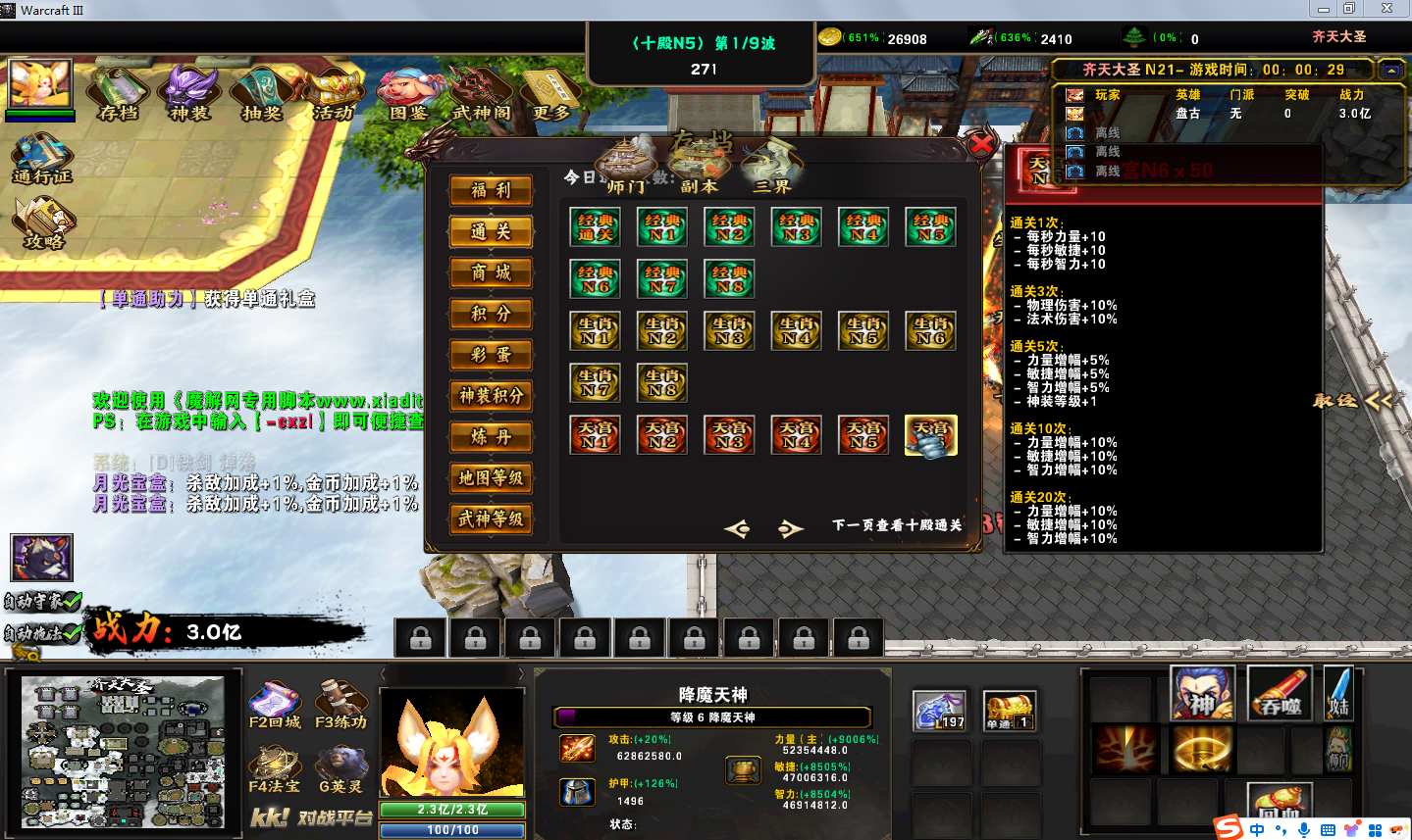 地图名字:齐天大圣1.0.139地图下载+全商城特权+全存档+隐藏英雄+无CD+指令功能