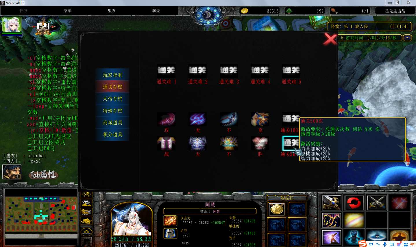 地图名字:防守天花板1.0.129地图下载+全商城特权+全存档+隐藏英雄+无CD+指令功能