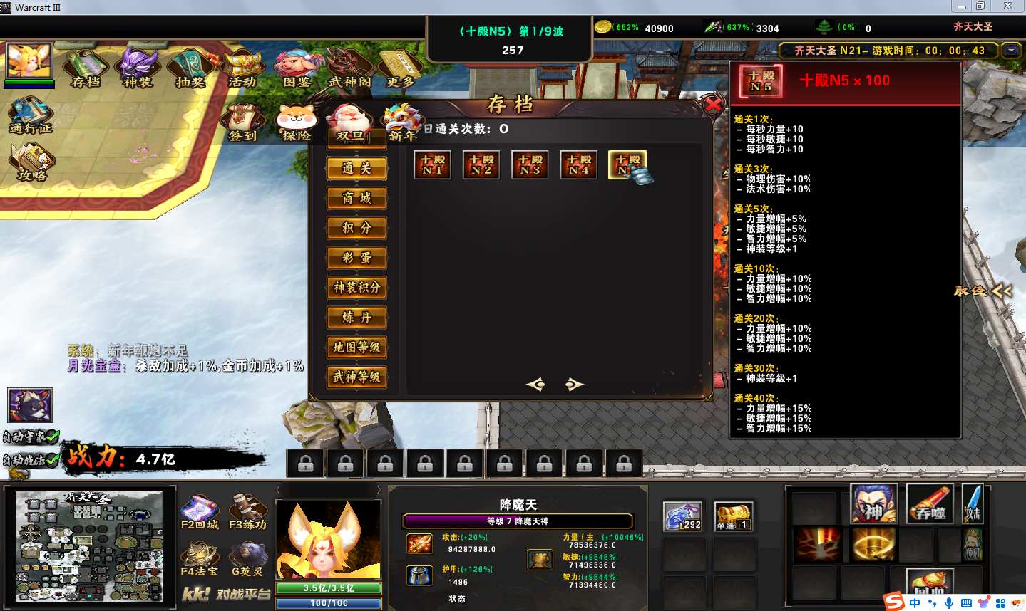 地图名字:齐天大圣1.0.141地图下载+全商城特权+全存档+隐藏英雄+无CD+指令功能