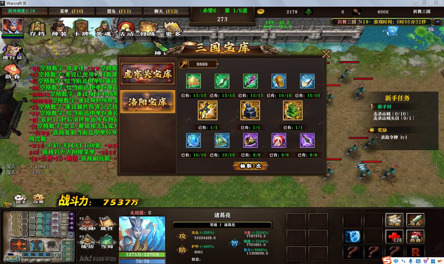 地图名字:剑舞三国1.0.113地图下载+全商城特权+全存档+隐藏英雄+无CD+指令功能