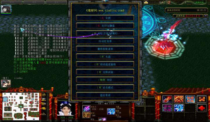 | 技能菜单【光环类技能】 | 自动化菜单【自动加钱木,提升英雄三围】 |