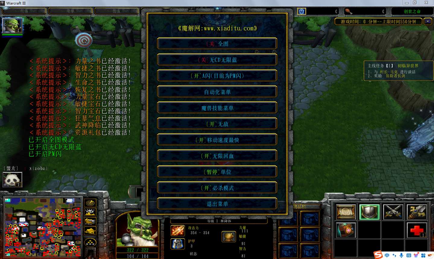 | 技能菜单【光环类技能】 | 自动化菜单【自动加钱木,提升英雄三围】 |