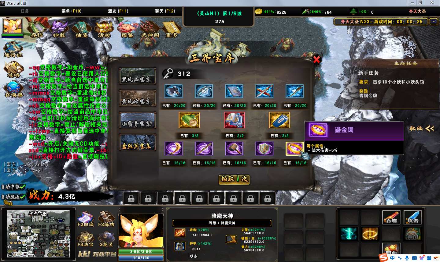 地图名字:齐天大圣1.0.152地图下载+全商城特权+全存档+隐藏英雄+无CD+指令功能