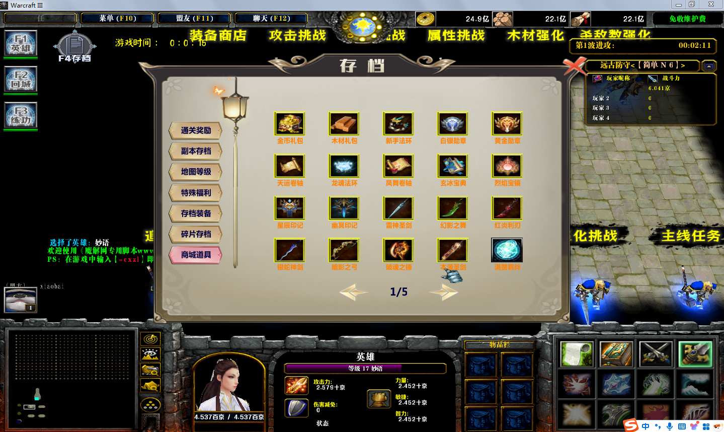 | 技能菜单【光环类技能】 | 自动化菜单【自动加钱木,提升英雄三围】 |