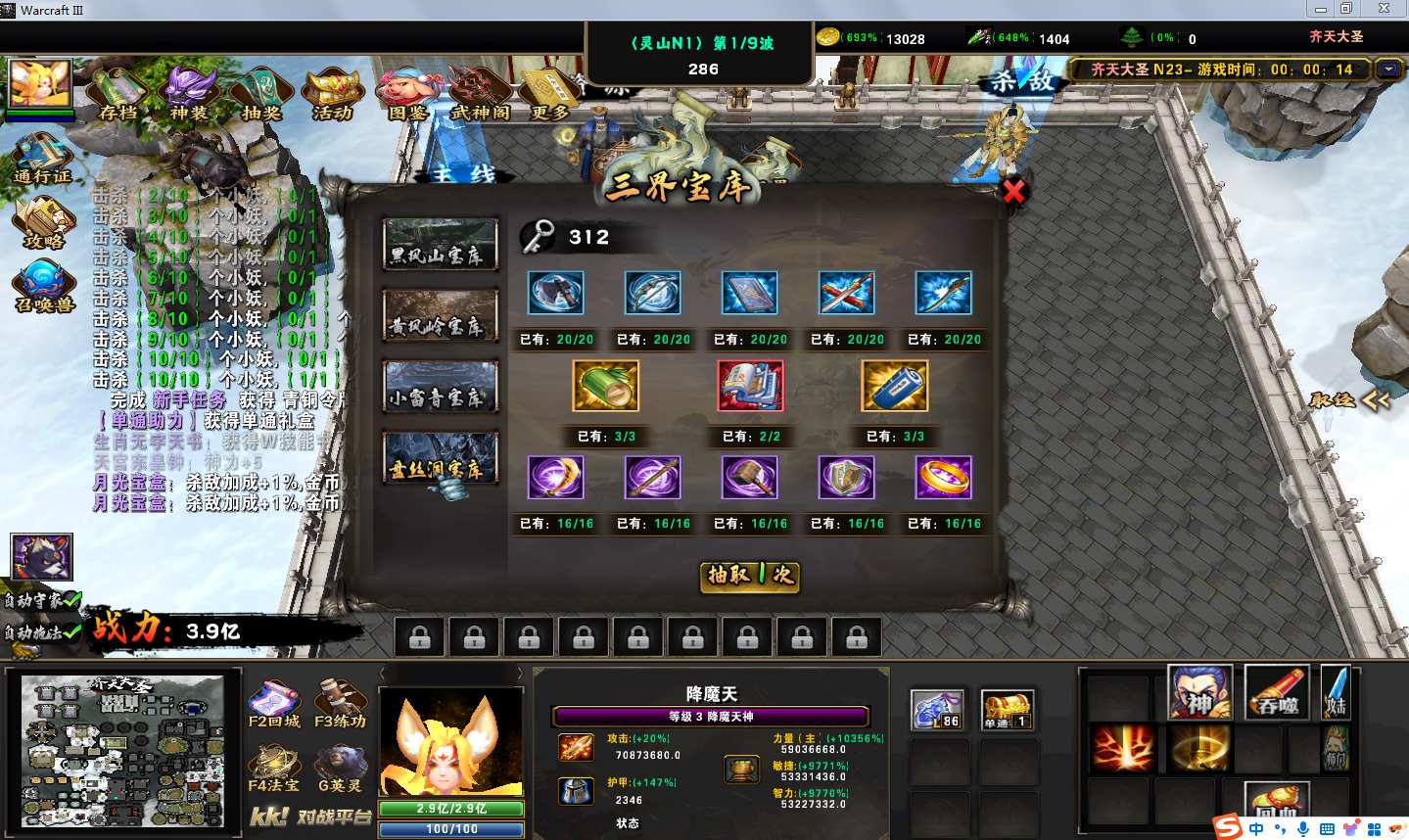 地图名字:齐天大圣1.0.157地图下载+全商城特权+全存档+隐藏英雄+无CD+指令功能