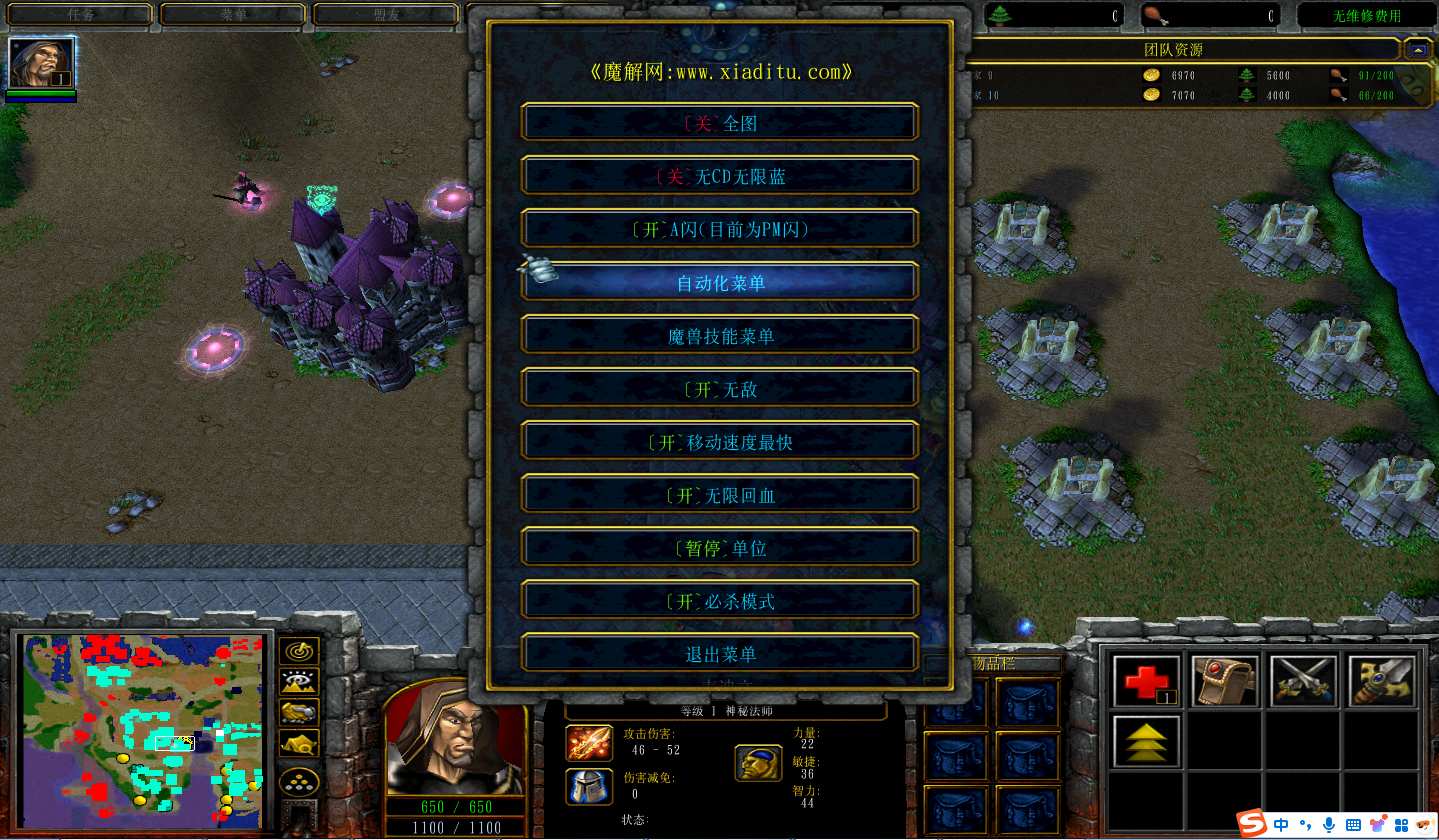 | 技能菜单【光环类技能】 | 自动化菜单【自动加钱木,提升英雄三围】 |