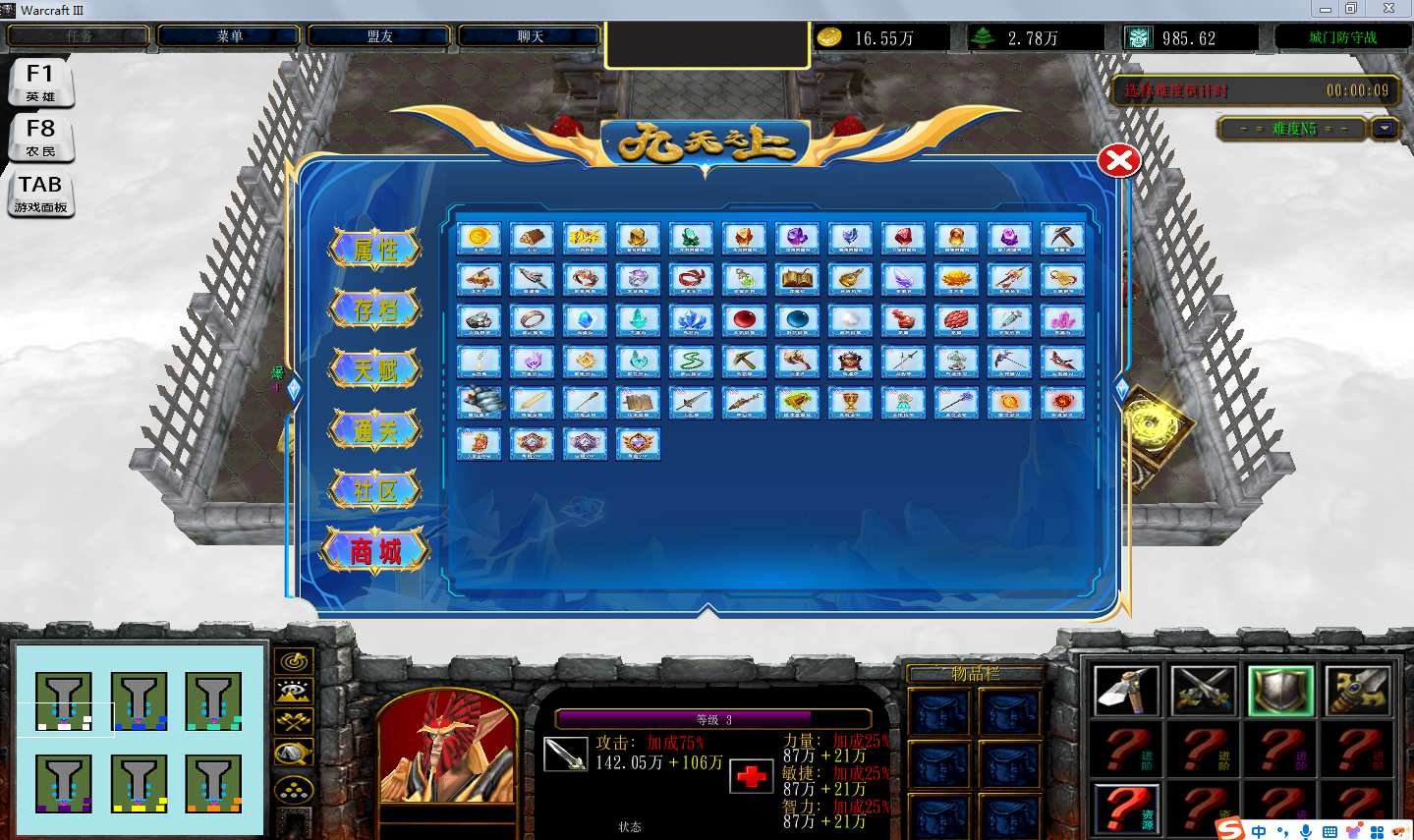 | 技能菜单【光环类技能】 | 自动化菜单【自动加钱木,提升英雄三围】 |