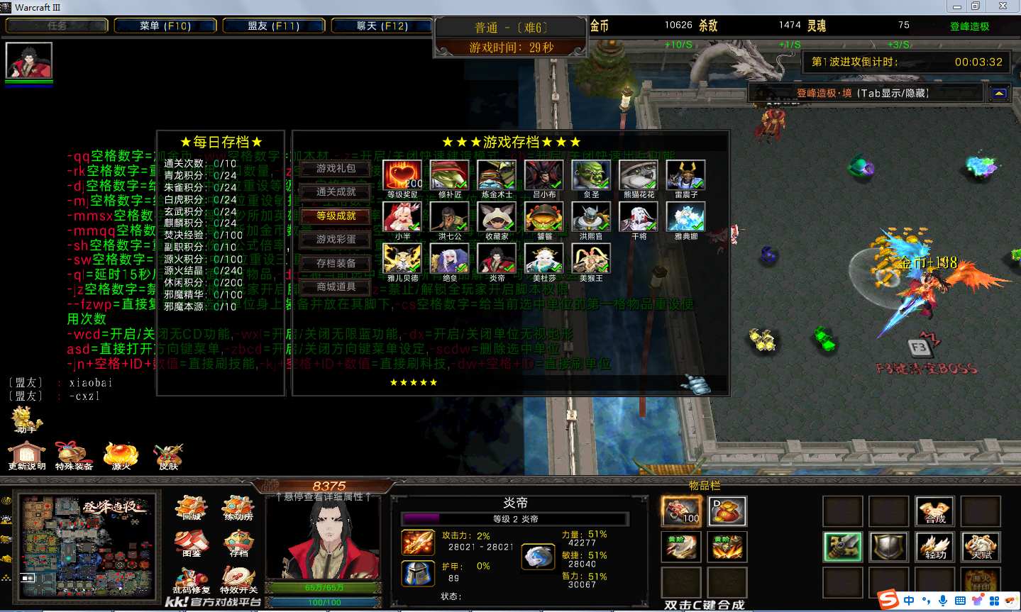 地图名字:登峰造极1.1.1地图下载+全商城特权+全存档+隐藏英雄+无CD+指令功能