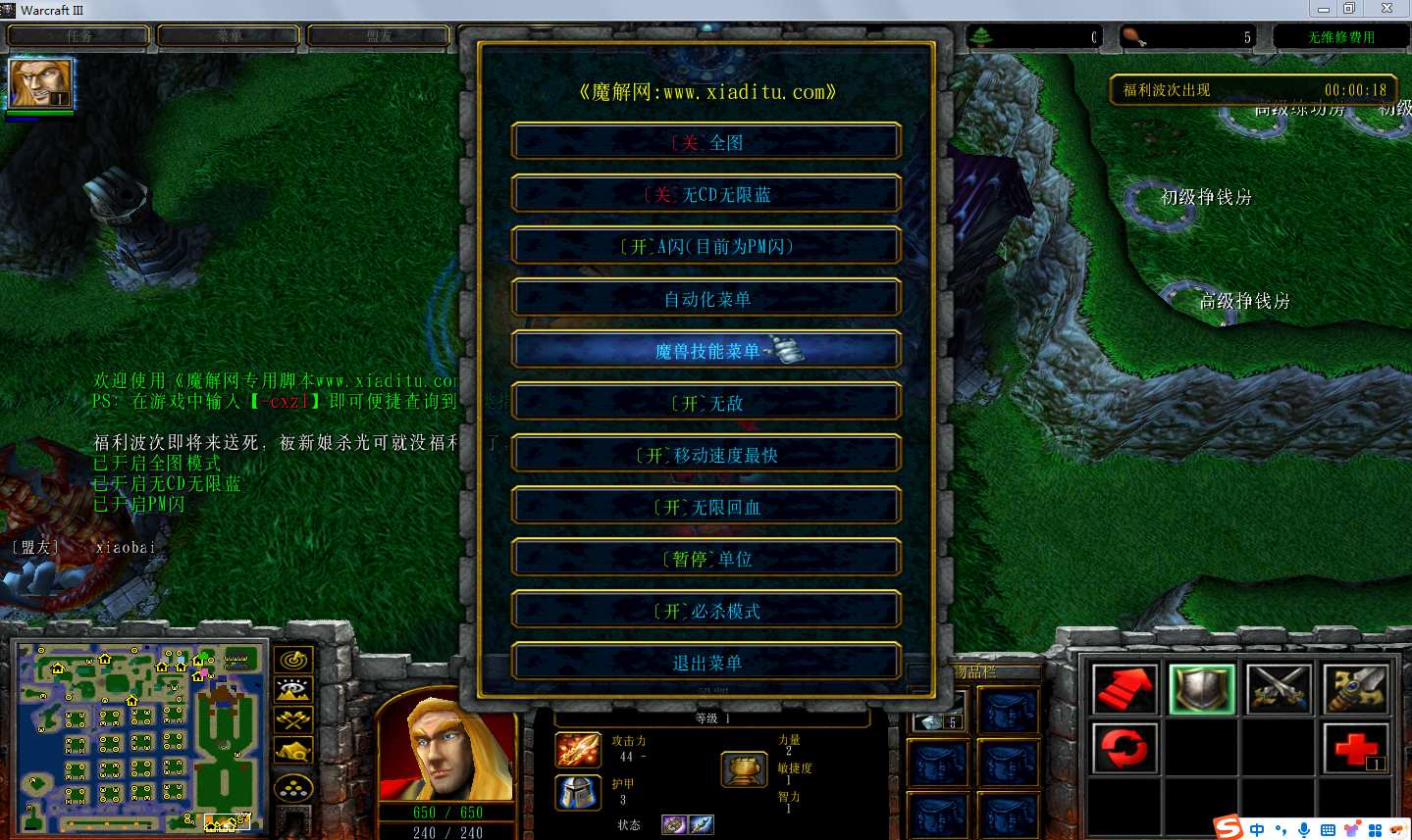 | 技能菜单【光环类技能】 | 自动化菜单【自动加钱木,提升英雄三围】 |