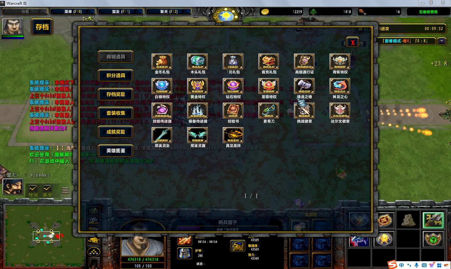 | 技能菜单【光环类技能】 | 自动化菜单【自动加钱木,提升英雄三围】 |