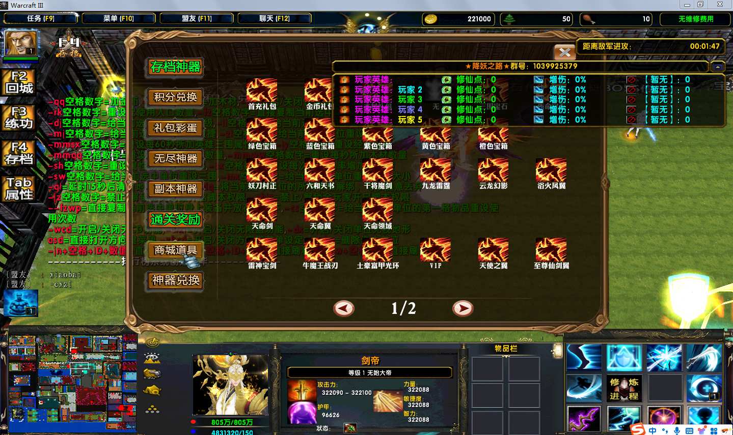 | 技能菜单【光环类技能】 | 自动化菜单【自动加钱木,提升英雄三围】 |
