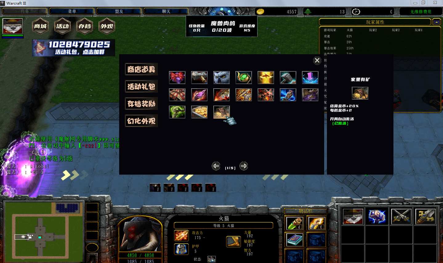 | 技能菜单【光环类技能】 | 自动化菜单【自动加钱木,提升英雄三围】 |