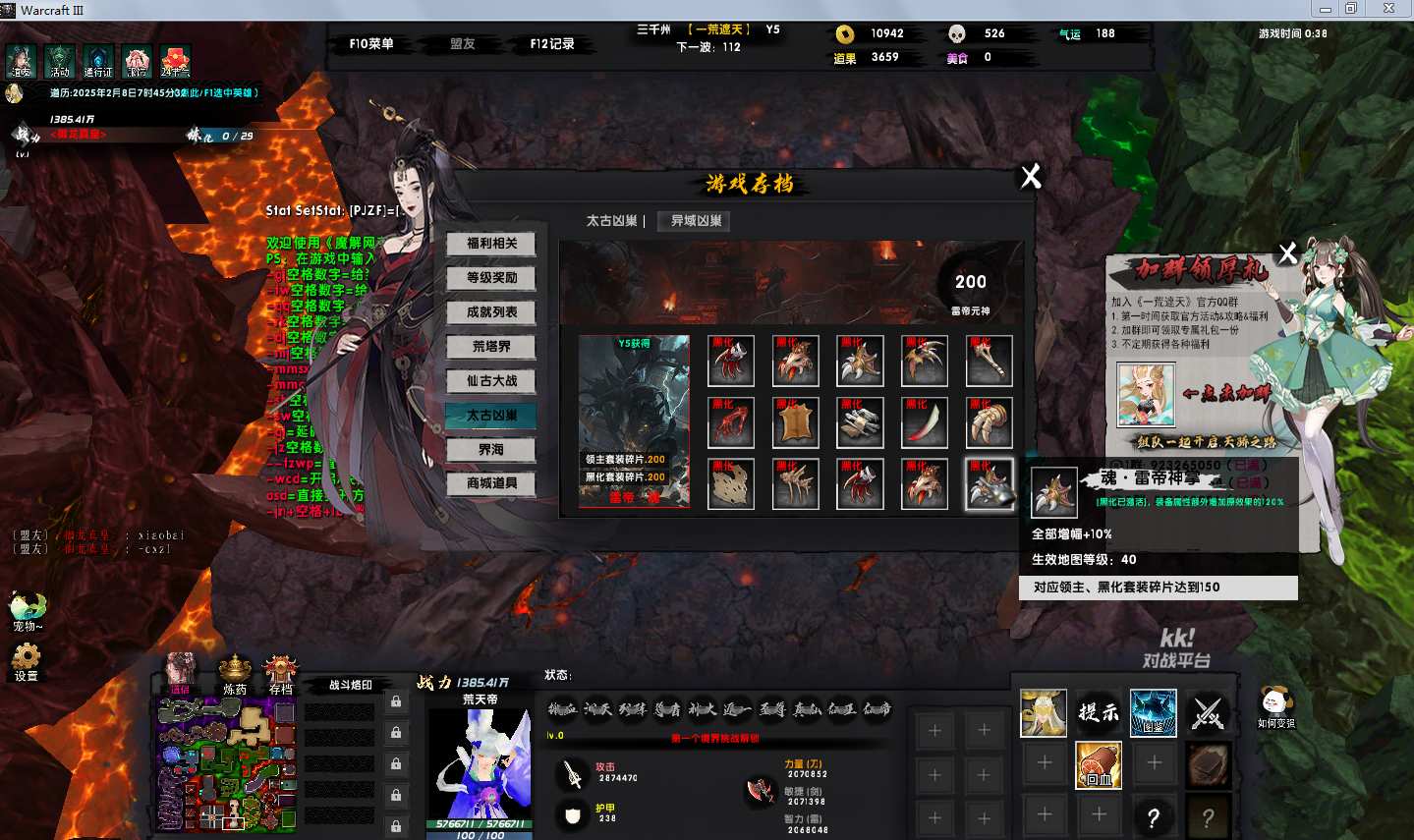 地图名字:一荒遮天1.2.1地图下载+全商城特权+全存档+隐藏英雄+无CD+指令功能