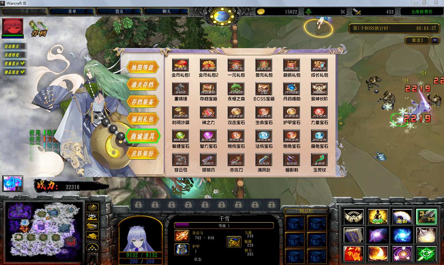 | 技能菜单【光环类技能】 | 自动化菜单【自动加钱木,提升英雄三围】 |