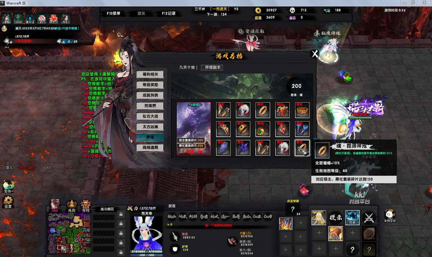 一荒遮天1.2.8地图下载+全商城特权+全存档+隐藏英雄+无CD+指令功能: