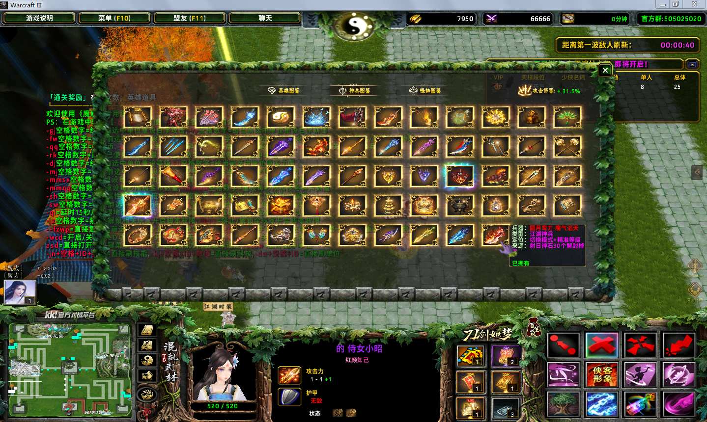 地图名字:混乱武林TD刀剑如梦6.9.213地图下载+全商城特权+全存档+隐藏英雄+无CD+指令功能