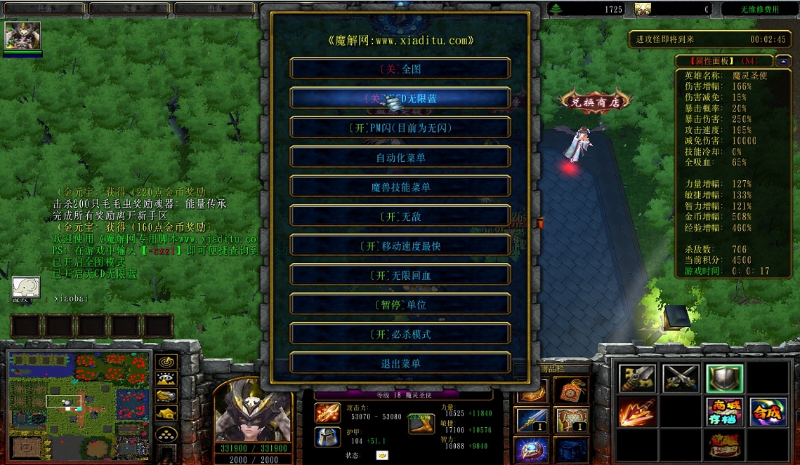 | 技能菜单【光环类技能】 | 自动化菜单【自动加钱木,提升英雄三围】 |