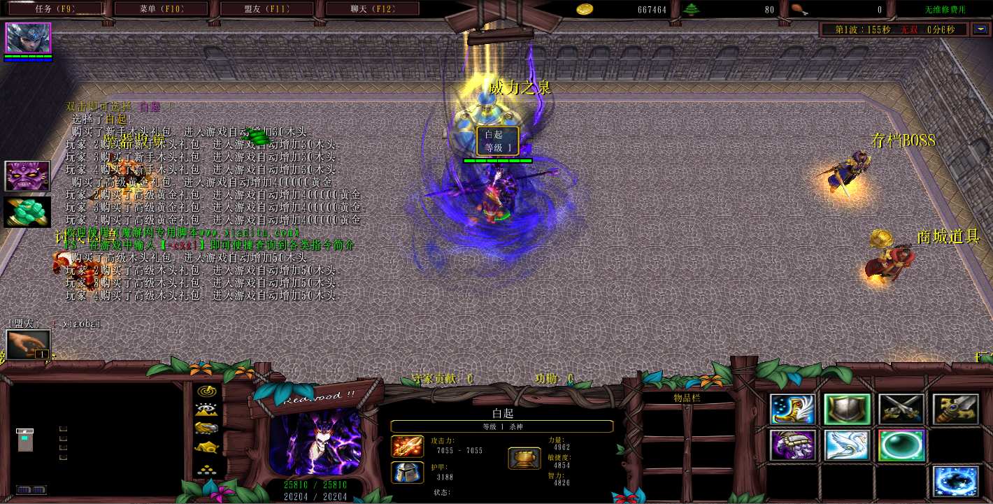 | 技能菜单【光环类技能】 | 自动化菜单【自动加钱木,提升英雄三围】 |