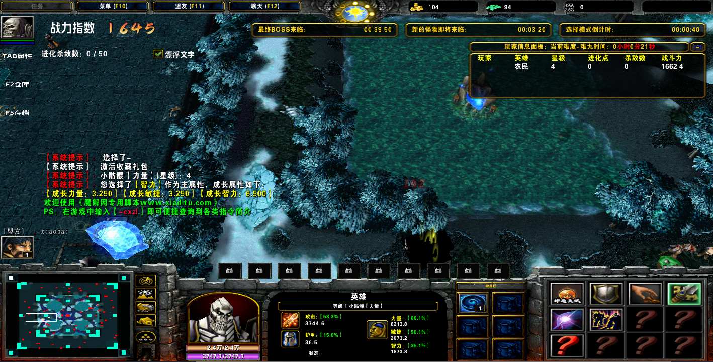 | 技能菜单【光环类技能】 | 自动化菜单【自动加钱木,提升英雄三围】 |