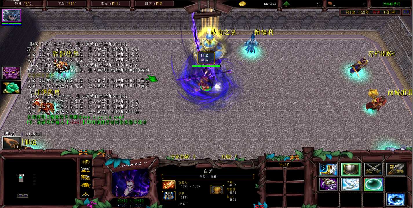 | 技能菜单【光环类技能】 | 自动化菜单【自动加钱木,提升英雄三围】 |