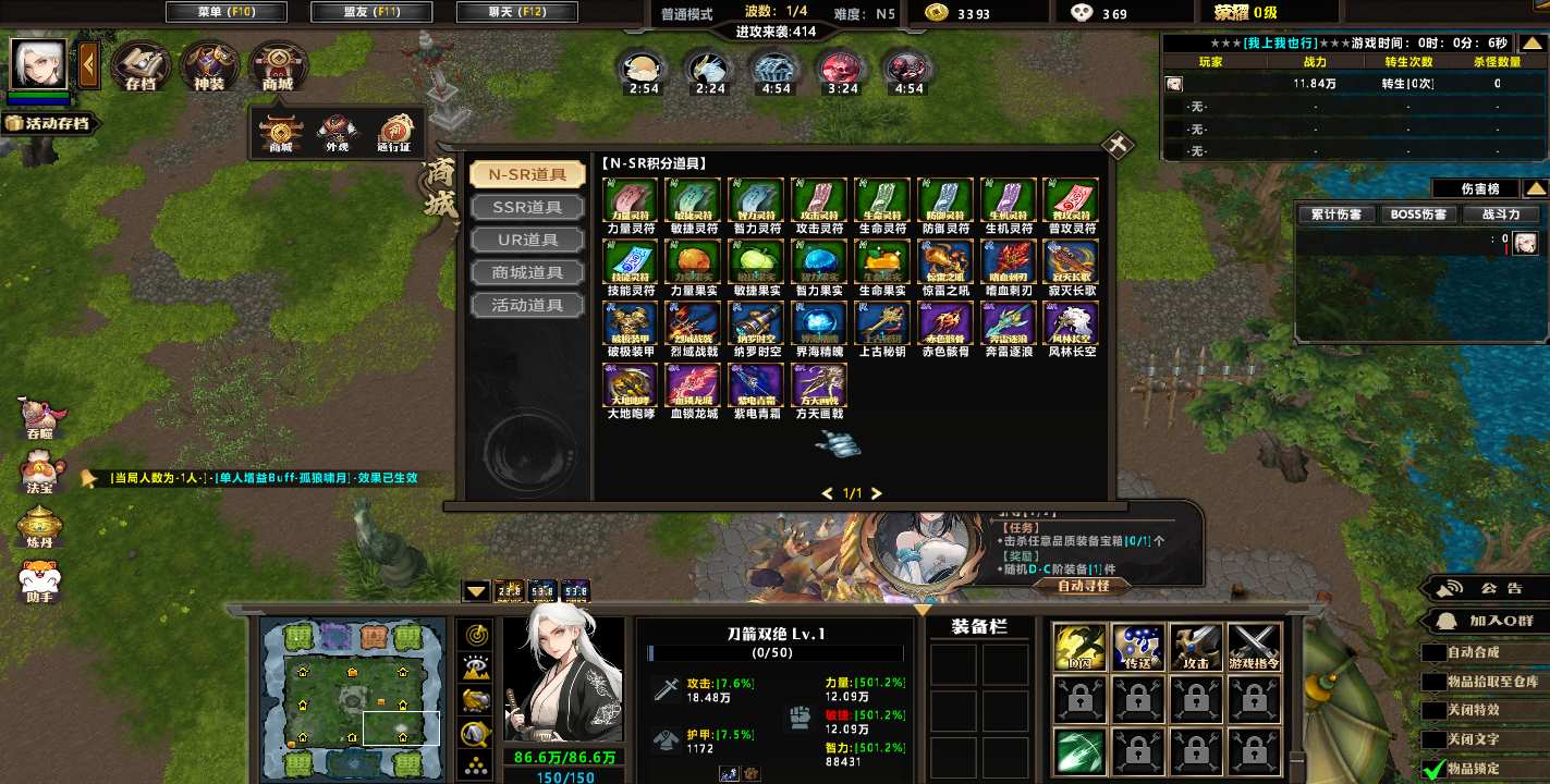 | 技能菜单【光环类技能】 | 自动化菜单【自动加钱木,提升英雄三围】 |