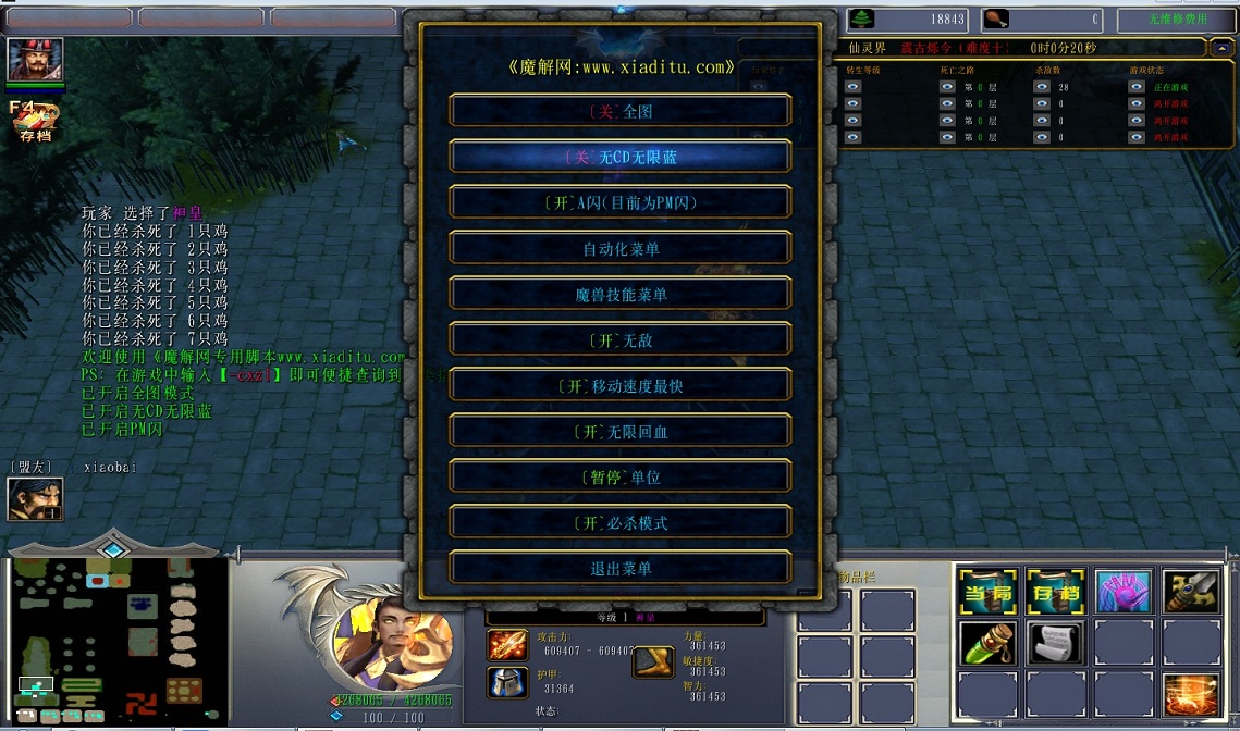 | 技能菜单【光环类技能】 | 自动化菜单【自动加钱木,提升英雄三围】 |