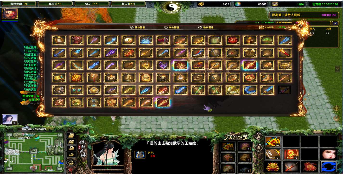 地图名字:混乱武林TD刀剑如梦7.0.9地图下载+全商城特权+全存档+隐藏英雄+无CD+指令功能