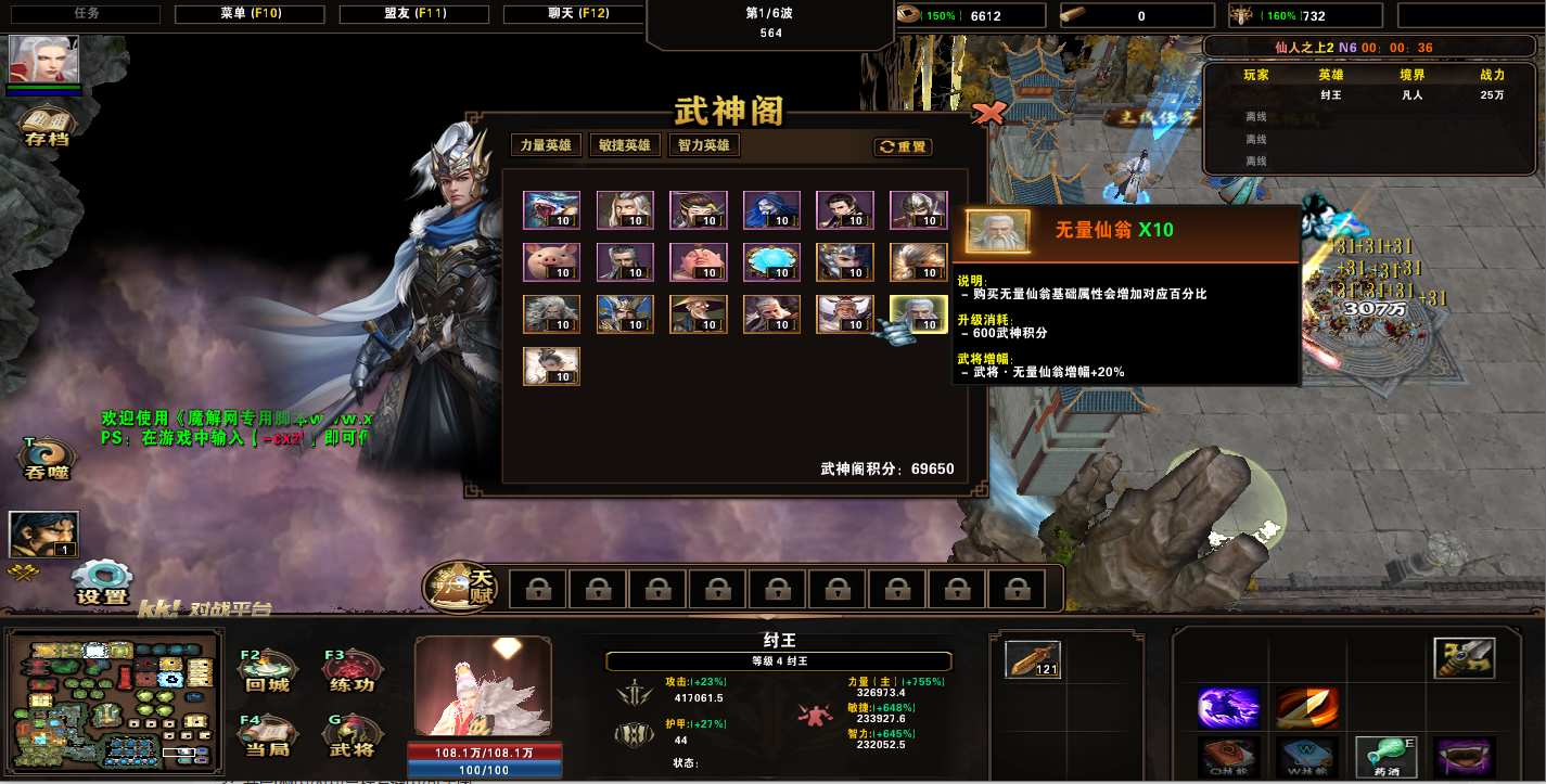 地图名字:仙人之上2 1.0.23地图下载+全商城特权+全存档+隐藏英雄+无CD+指令功能